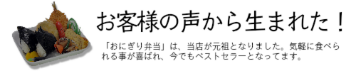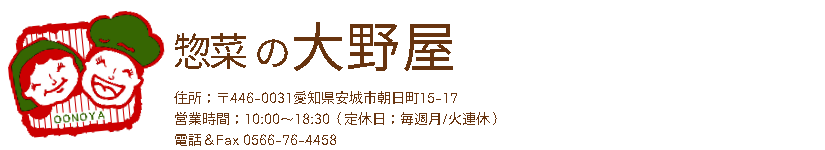 出身地が(知多半島大野町)と言うこともありまして店名を「大野屋」と命名し故郷への感謝の気持ちを店名に残し新しい一歩を踏み出しました。昭和42年には”揚げ物屋”としての転機を向かえ2代目と共に一家で頑張りました。その後高度成長の時代には多くのお客様から指示され”惣菜専門店”としての地位を確立して行く事が出来ました。そんななか、ある日お客様の声があり「気軽に食べられるお弁当はないのか?」とお言葉を頂き考案されたのが”おにぎり弁当”です。オリジナルとして誕生し元祖おにぎり弁当は今でもベストセラーとなっております。それ以来お弁当にも力をそそぐようになり3代目の頑張りもあり新たに”中華惣菜”を取り入れるなど絶えずお客様の”声”を大切にしながら飽きの来ない品揃えを心がけ旬の食材を提供させて頂いております。これからも末永くご愛顧賜りますようにお願い申し上げます。